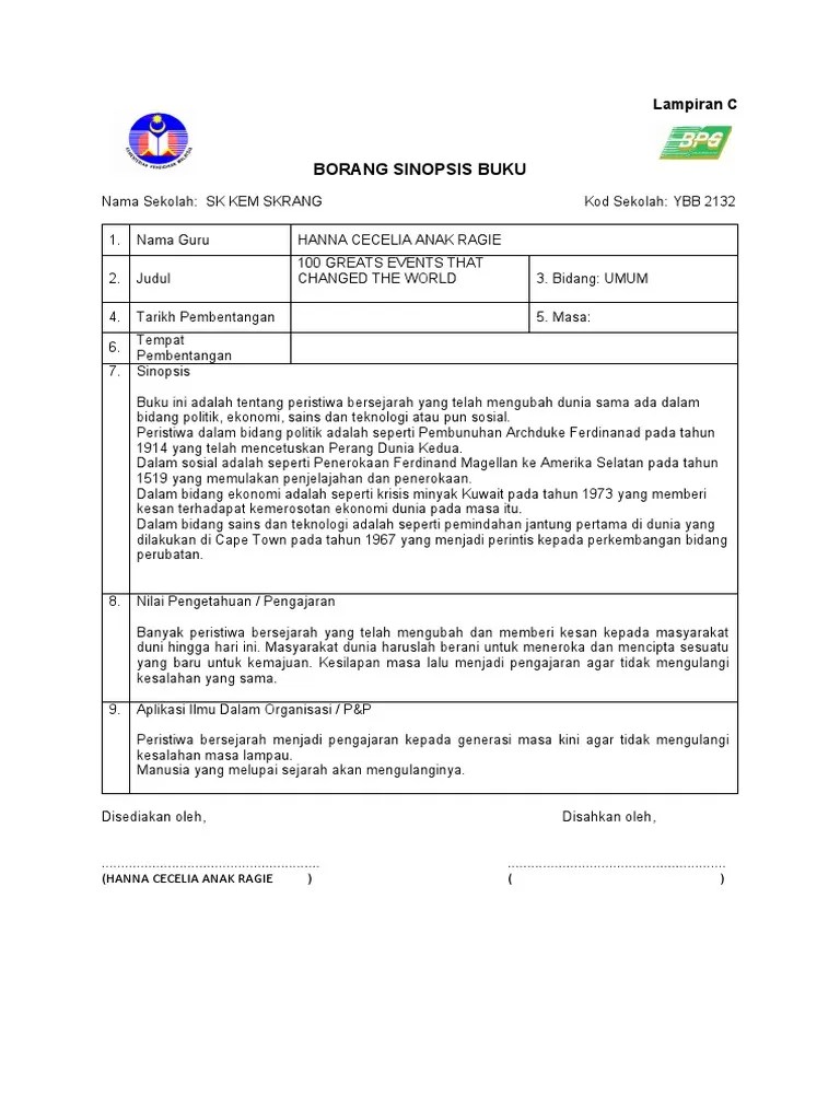 Lampiran c borang sinopsis buku nama sekolah : Oleh itu cikgu2, selamat membaca semasa cuti sekolah ini ya. Nama guru hamka bin ramlan 2.